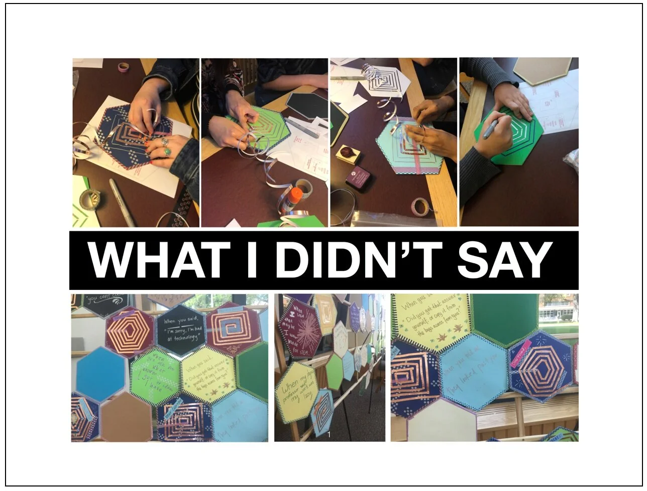 To facilitate open dialogue around the experiences of women and non-binary individuals studying and teaching in cisman-dominated Science, Technology, Engineering, Arts, and Mathematics (STEAM) fields, participants in the Crafting Sound: Hidden Voices workshop co-created a sound installation entitled What I Didn’t Say. Each participant built and decorated a collection of hexagonal cards that were arranged together as a single, collective paper quilt. Participants created one card with a written description of an event that they experienced in their field, and a second card which included an electromagnet they built out of copper tape and a small recording and playback module. Using this module, participants recorded responses to the prompt “When x, what I didn’t say was…” The paper quilt was presented in the Science Library at Oberlin College in Oberlin, Ohio. The project put the onus on installation visitors to seek out and actively listen to the experiences and thoughts of women and nonbinary individuals in STEAM fields: visitors were given equipment that allowed them to find and hear the participants’ recordings—entirely inaudible to the naked ear—transmitted through electromagnetic waves.